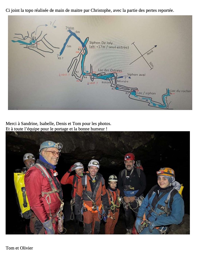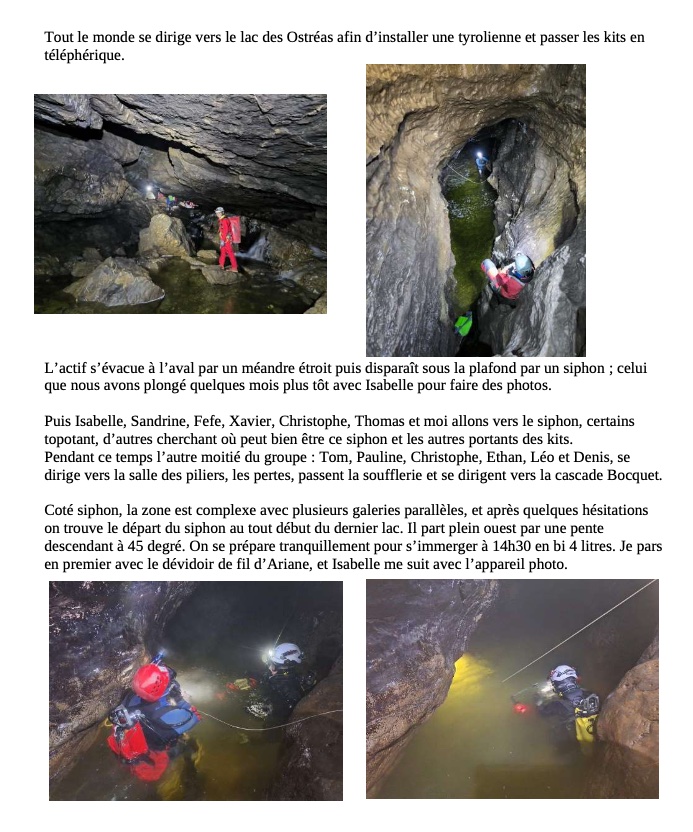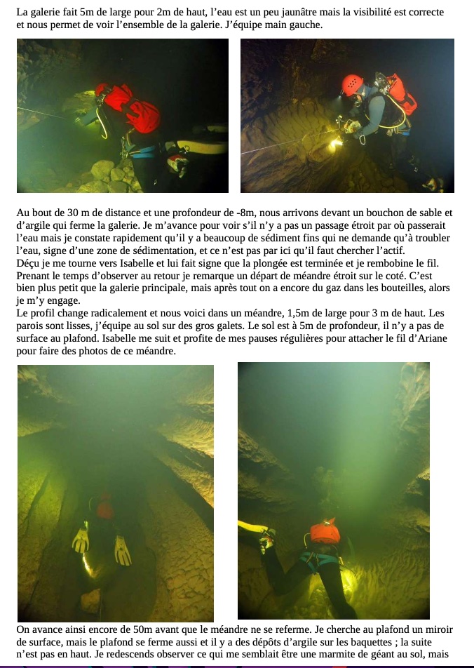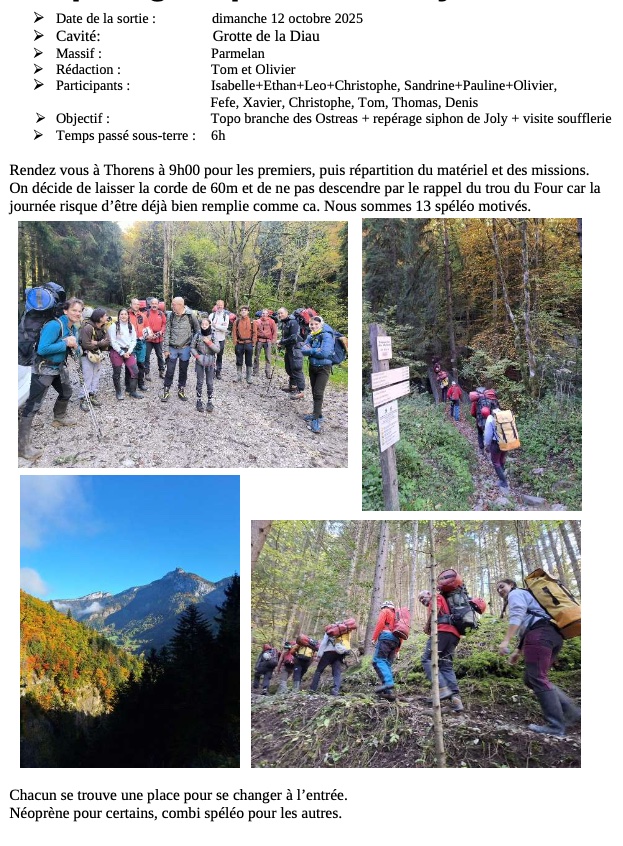 Dimanche 12 octobre nous sommes sorti avec un grand groupe à la grotte de la Diau. Après une dur marche d’approche écrasé par le poids du matériel de plongé de Olivier et Isabelle, nous nous sommes rendu au niveau du premier lac. Un petit groupe dont je fais parti ne l’a pas traversé et sommes parti visité le reste de la grotte, notamment jusqu’à la soufflerie. Pendant ce temps, le reste du groupe s’est courageusement aventuré dans l’eau très froide des lacs qui se succèdent. Après un petit temps de recherche Olivier et Isabelle ont réussi à trouver le siphon qu’ils voulaient explorer. Après une plongée d’une dizaine de minutes, ils ont décidé de faire demi-tour. Pendant ce temps, une autre petite équipe réalisait une magnifique topographie, dans un environnement compliqué notamment à cause de l’eau froide.