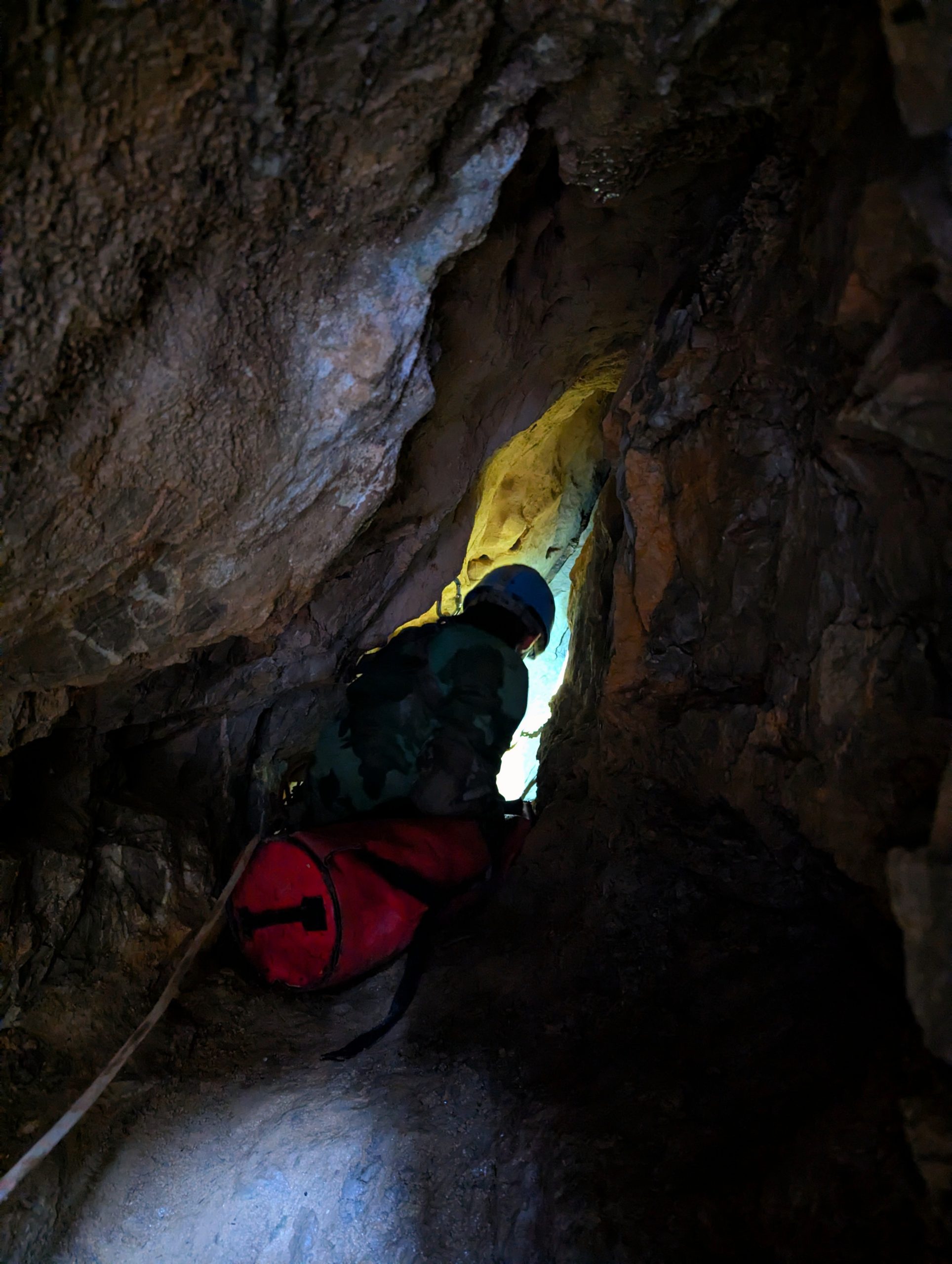 Après le ressaut d’entrée, je vois qu’il y a du spit. C’est parfois un peu rouillé, mais un  peu de taraud en vient à bout. Le perfo n’a cependant pas fait le voyage pour rien, car il y  a matière à doubler certains points et faire quelques dév en AF.