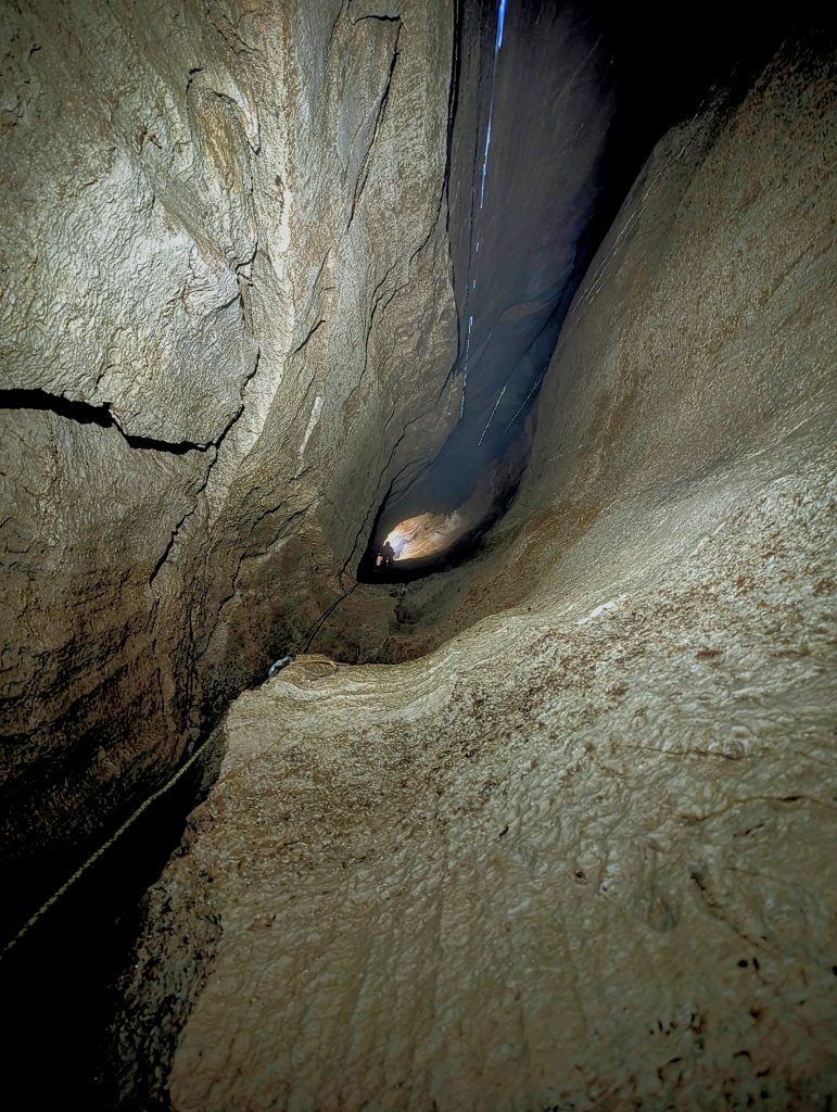 Après une entrée horizontale un peu étroite pour un gros qui traine 150m de cordes, le  perfo et la quincaille, le gouXre commence par une petite longueur d’environ 10m  donnant sur un palier qui permet d’accéder au vrai grand puits, qui est magnifique, et va  en s’élargissant. Il y a une première longueur d’une bonne cinquantaine de mètres avant  le premier fractio.