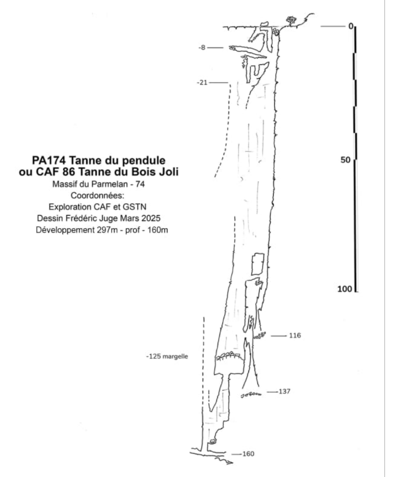 Cela pose une question métaphysique, sur laquelle je sollicite l’avis des experts, sur la  définition même d’un puits. En eXet, ici, personnellement je ne vois pas de P153. La  verticale la plus grande part de la « tête de puits » vers -10, et s’arrête là où on s’est  arrêtés, vers -110. Donc moi je vois un p100. On peut compter les choses autrement, en  faisant commencer le « puits » là il est obstrué, tout prêt de la surface, et tirer un trait oblique presque jusqu’au fond, et j’imagine que c’est comme ça qu’on trouve un P153. Mais moi je dirais plutôt qu’on a un P100, qu’il faut s’arrêter de descendre à -94 pour  prendre une vire qui permet d’accéder à un P50.