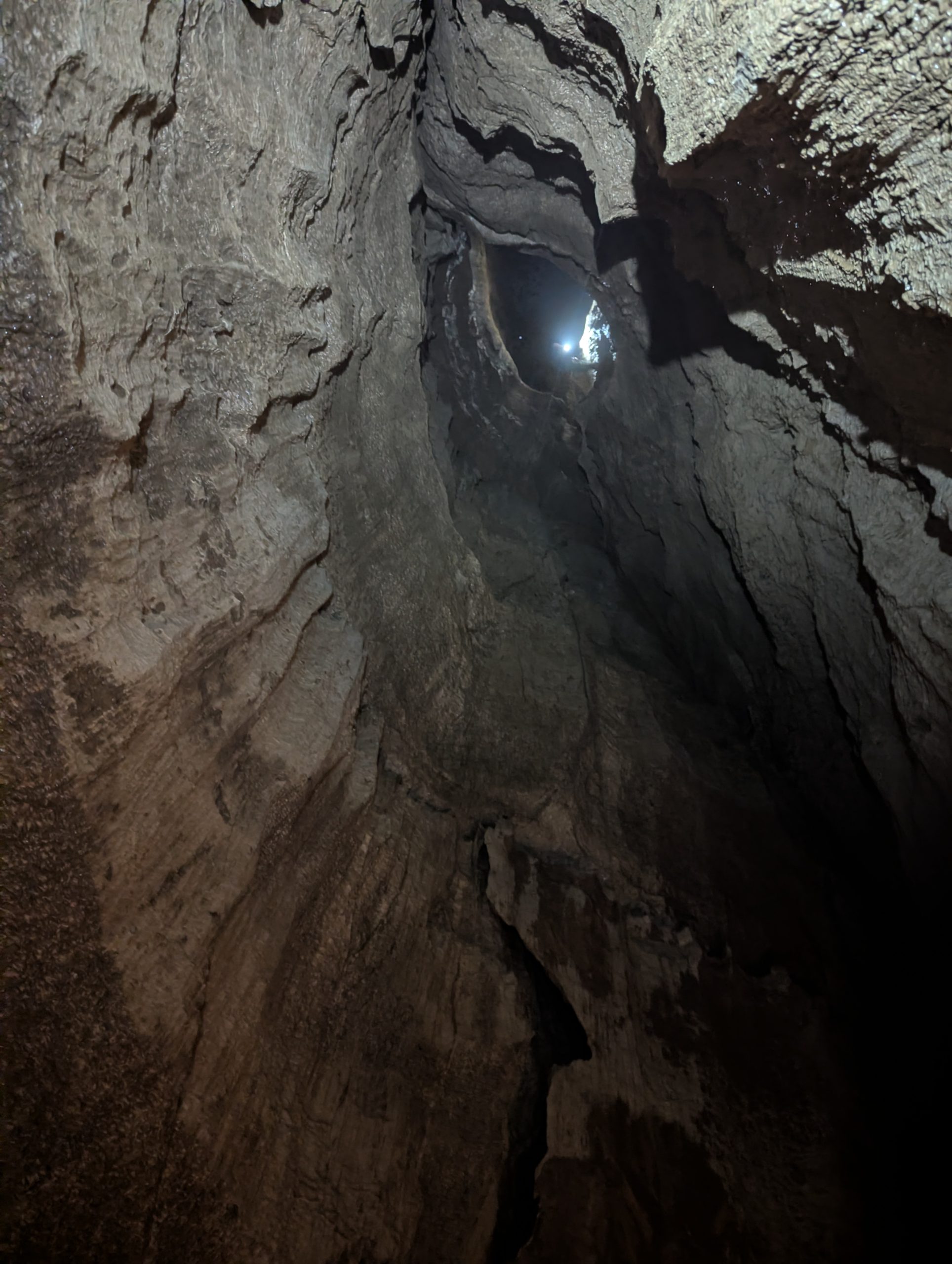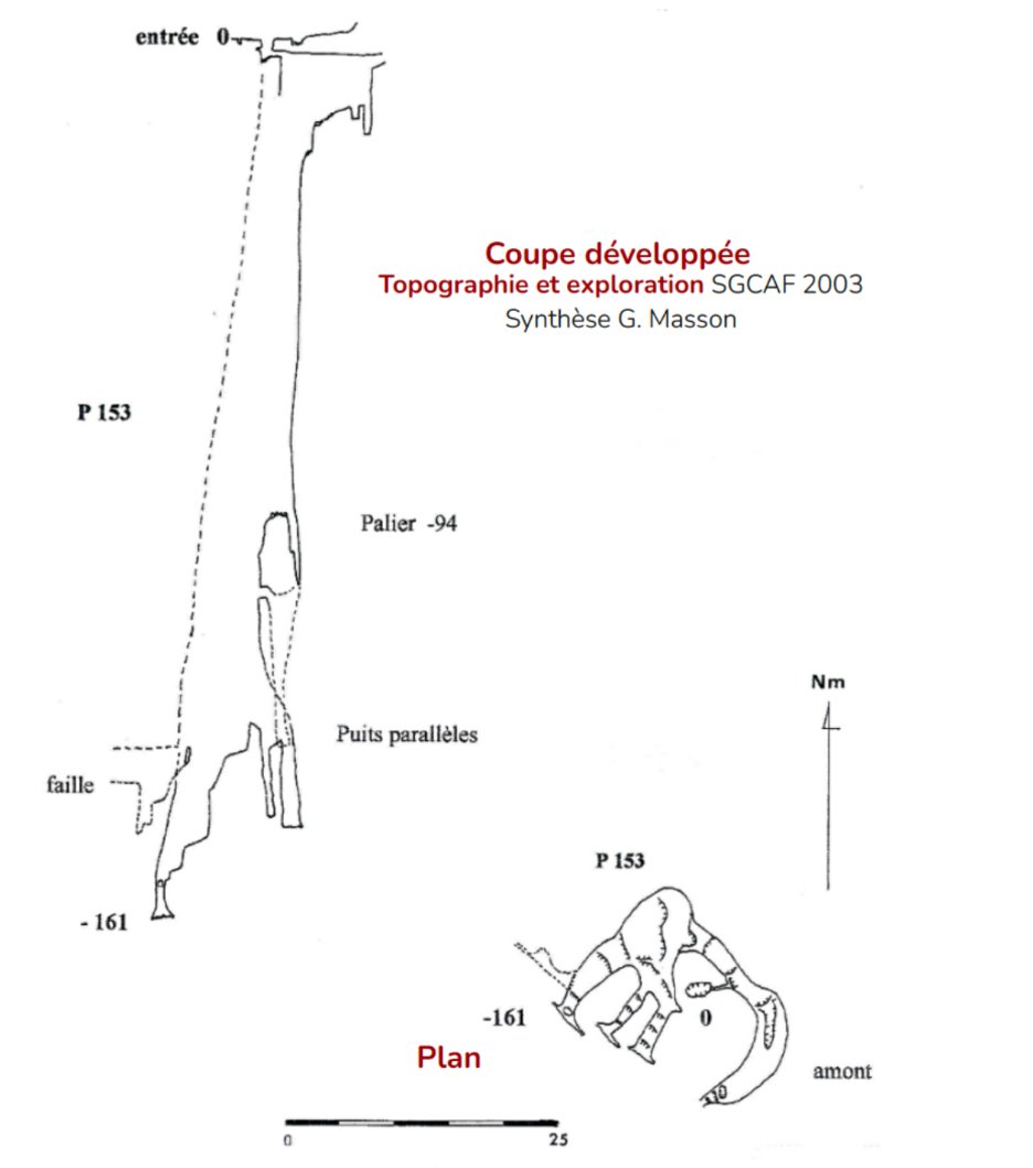 Cela pose une question métaphysique, sur laquelle je sollicite l’avis des experts, sur la  définition même d’un puits. En eXet, ici, personnellement je ne vois pas de P153. La  verticale la plus grande part de la « tête de puits » vers -10, et s’arrête là où on s’est  arrêtés, vers -110. Donc moi je vois un p100. On peut compter les choses autrement, en  faisant commencer le « puits » là il est obstrué, tout prêt de la surface, et tirer un trait oblique presque jusqu’au fond, et j’imagine que c’est comme ça qu’on trouve un P153. Mais moi je dirais plutôt qu’on a un P100, qu’il faut s’arrêter de descendre à -94 pour  prendre une vire qui permet d’accéder à un P50.