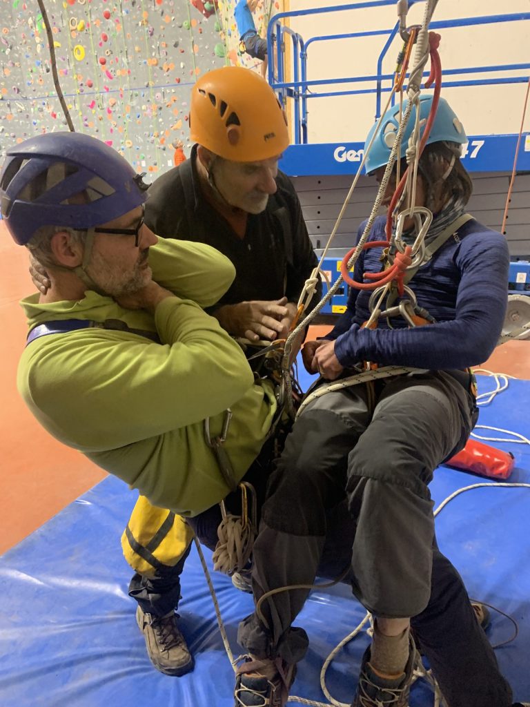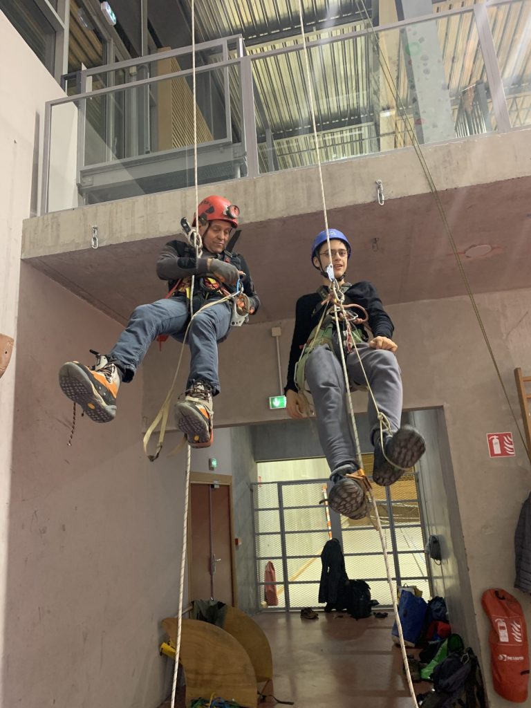 Pour bien commencer la soirée, j’oublie mon matériel dans la voiture et mon casque à la maison. Heureusement Olivier en avait un en rab. Pour la partie technique, comment descendre sur grosse corde en huit, travaille sur une main courante et descente sur corde de 6 mm, c’est pas gros!